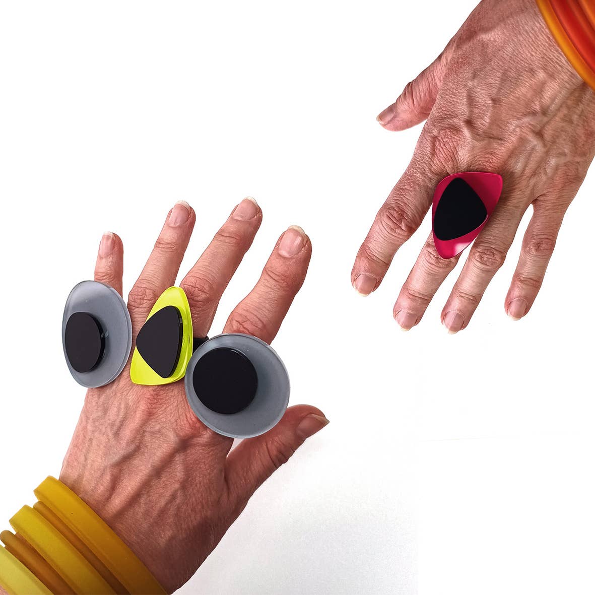 Made of high-end Acrylic with fingerstrap made of rubber All Acrylic elements are hand-polished with a special attention to every single detail. Each piece of our modern jewelry is carefully handcrafted in our studio in Paris, France