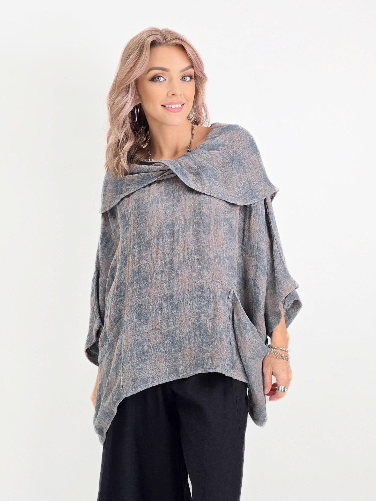Soft, relaxed, and beautifully sculptural, the Dress to Kill 2 Pocket Criss Cross Cowl Top features an easy oversized silhouette with gentle drape. The wide criss-cross cowl neckline adds artistic structure, while the two front pockets bring dimension and everyday practicality. Finished with a fluid hemline and loose sleeves, this top pairs effortlessly with full or lantern-style pants for a signature DTK layered look.