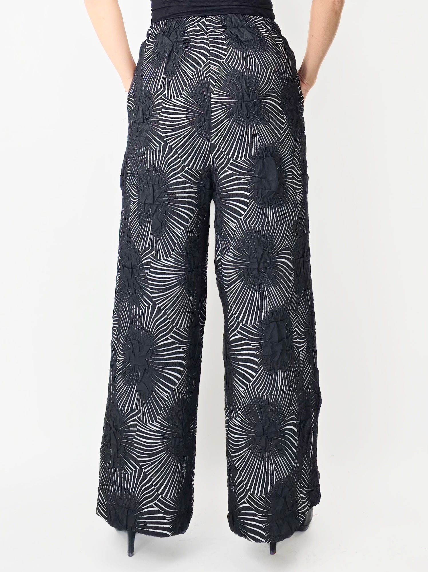 Step into bold sophistication with these wide-leg pants by Heydari, Featuring a striking black-and-white geometric stripe pattern accented with raised floral appliqué, these pants are both modern and timeless.