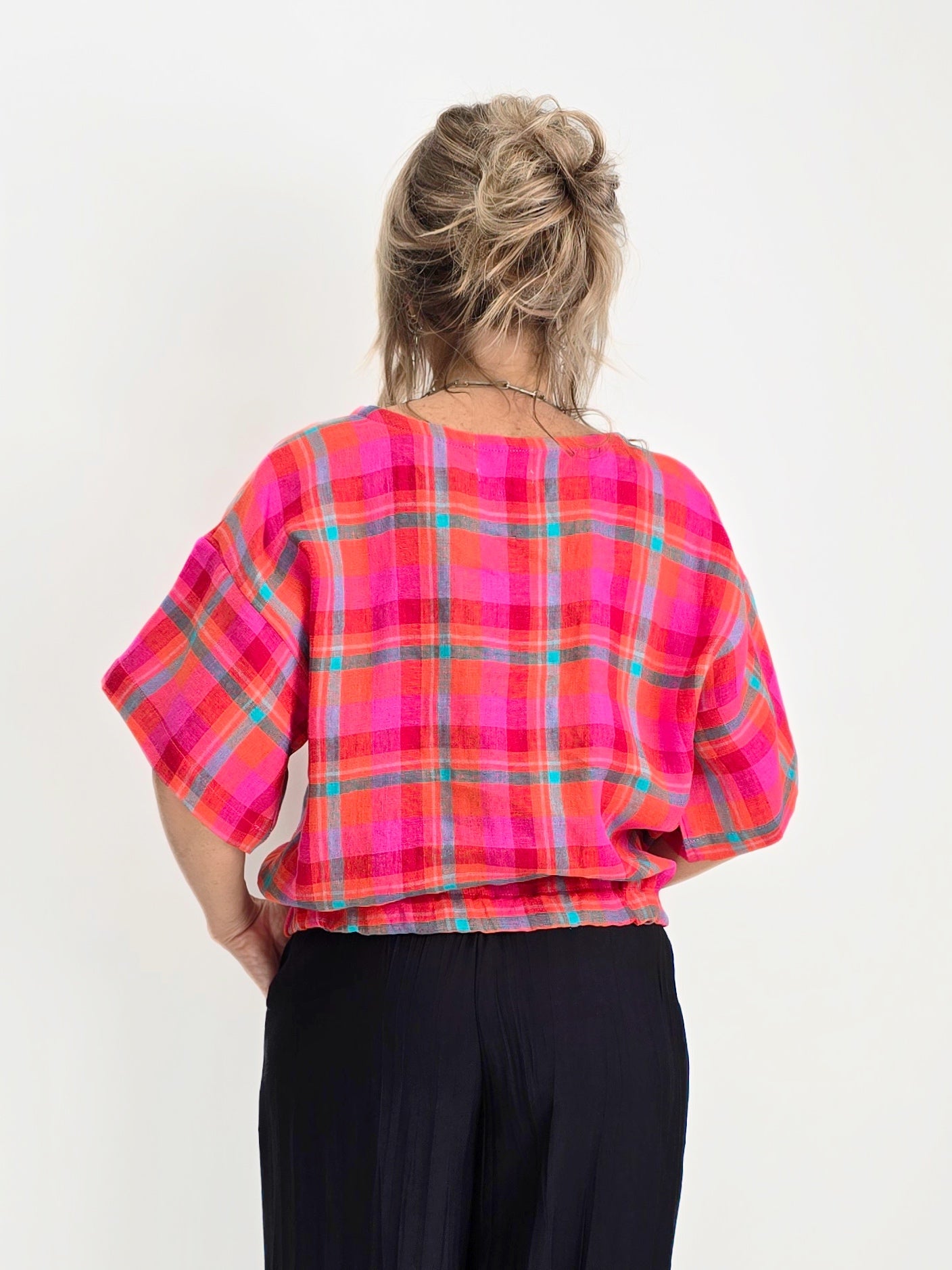 The artful plaid pattern blends rich pink tones for a sophisticated yet relaxed look
