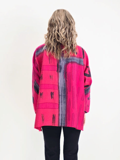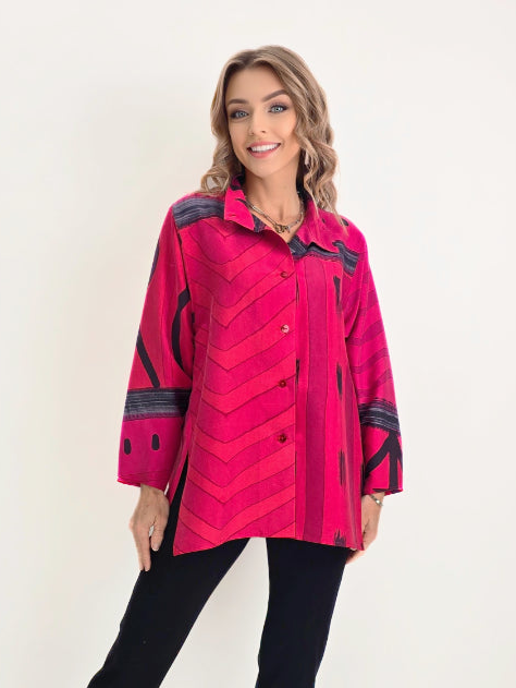 Elevate your style with our eye-catching A-line cotton shirt. This stunning piece features a stand-up collar, six black buttons for closure, and generous long sleeves. With slanted forward seams and side vents, it offers a comfortable and effortlessly chic fit. Make a statement with this beautifully styled shirt and add a vibrant splash to your wardrobe.