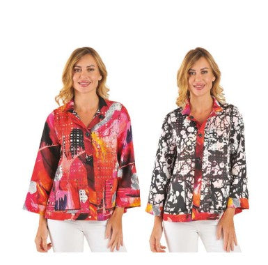 Two looks in one. This reversible jacket features vibrant rose-toned abstract art on one side and a graphic black-and-white print on the other. Finished with delicate laser-cut detailing for added texture and dimension.