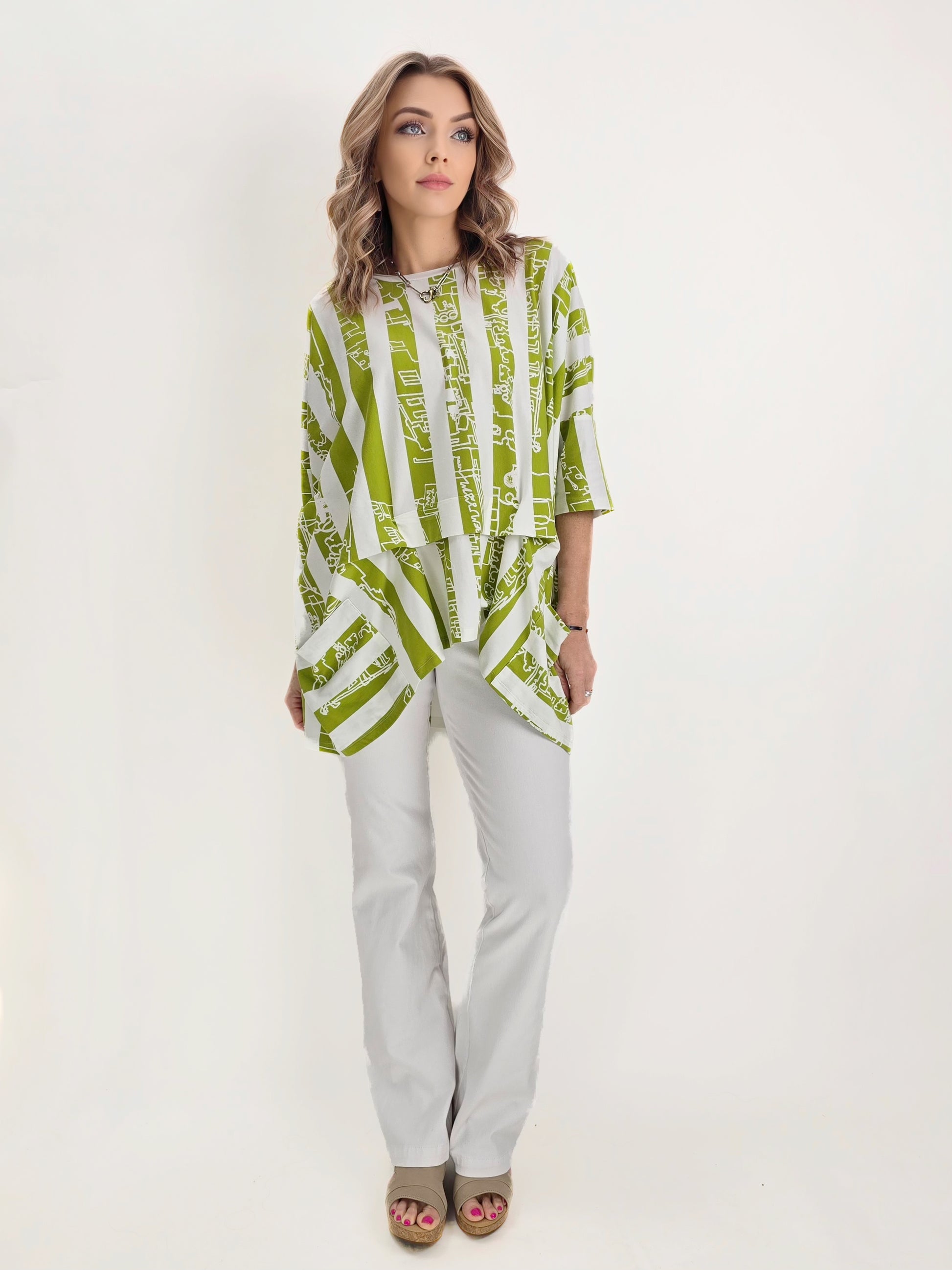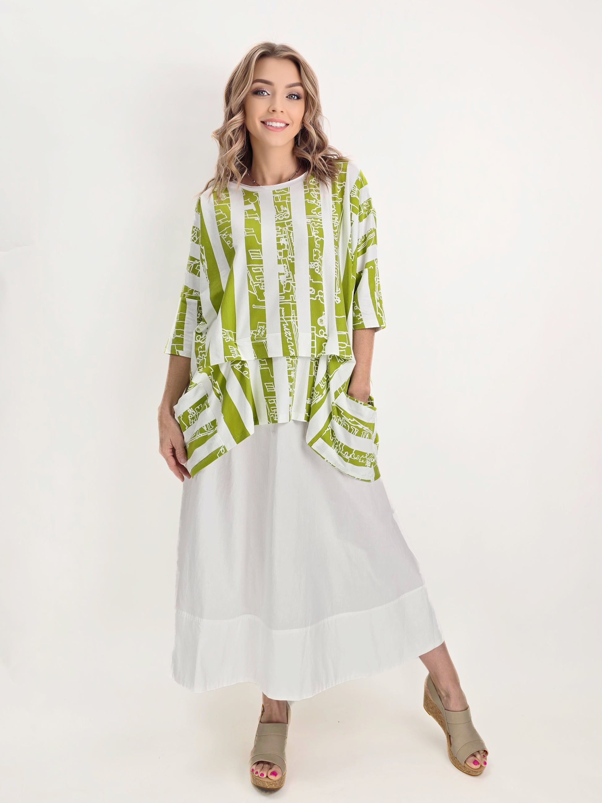 The LUUKAA Emryn Top combines expressive pattern with all-day comfort in a soft cotton stretch jersey. Featuring a relaxed silhouette and bold lime green and white stripe design, this top offers ease of movement with a modern, artistic edge. The layered hem detail adds dimension while creating a flattering, effortless drape.