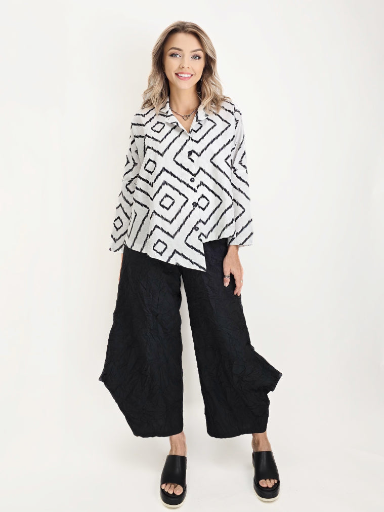 This statement shirt features a bold geometric pattern that catches the eye with its hand-drawn look