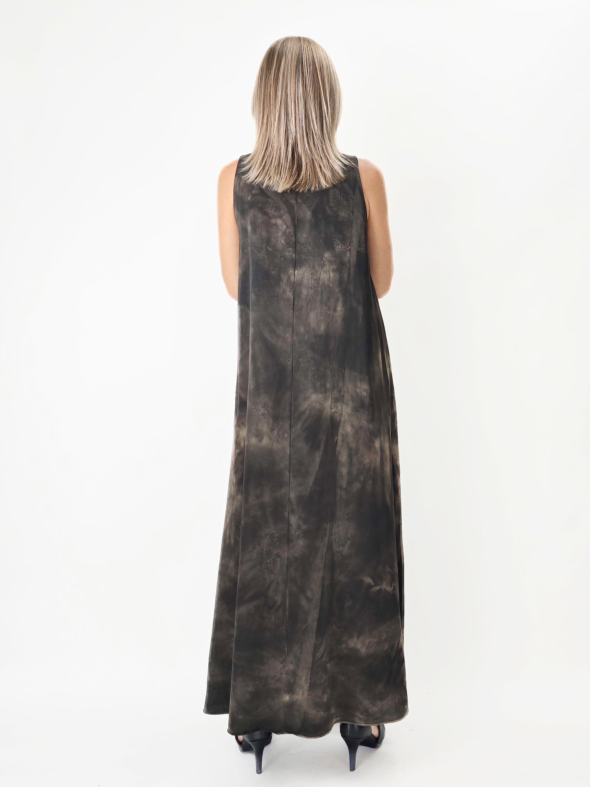 Effortlessly elegant, this flowing silk blend maxi dress is a one-of-a-kind creation, hand-dyed by a local artist to achieve its unique, organic patterning. The sleeveless cut and soft drape create a relaxed yet refined silhouette, while the subtle tonal shifts in the dyeing give the fabric beautiful depth and movement. Perfect for special occasions or elevated everyday wear, this dress embodies the essence of wearable art — timeless, artistic, and uniquely yours.