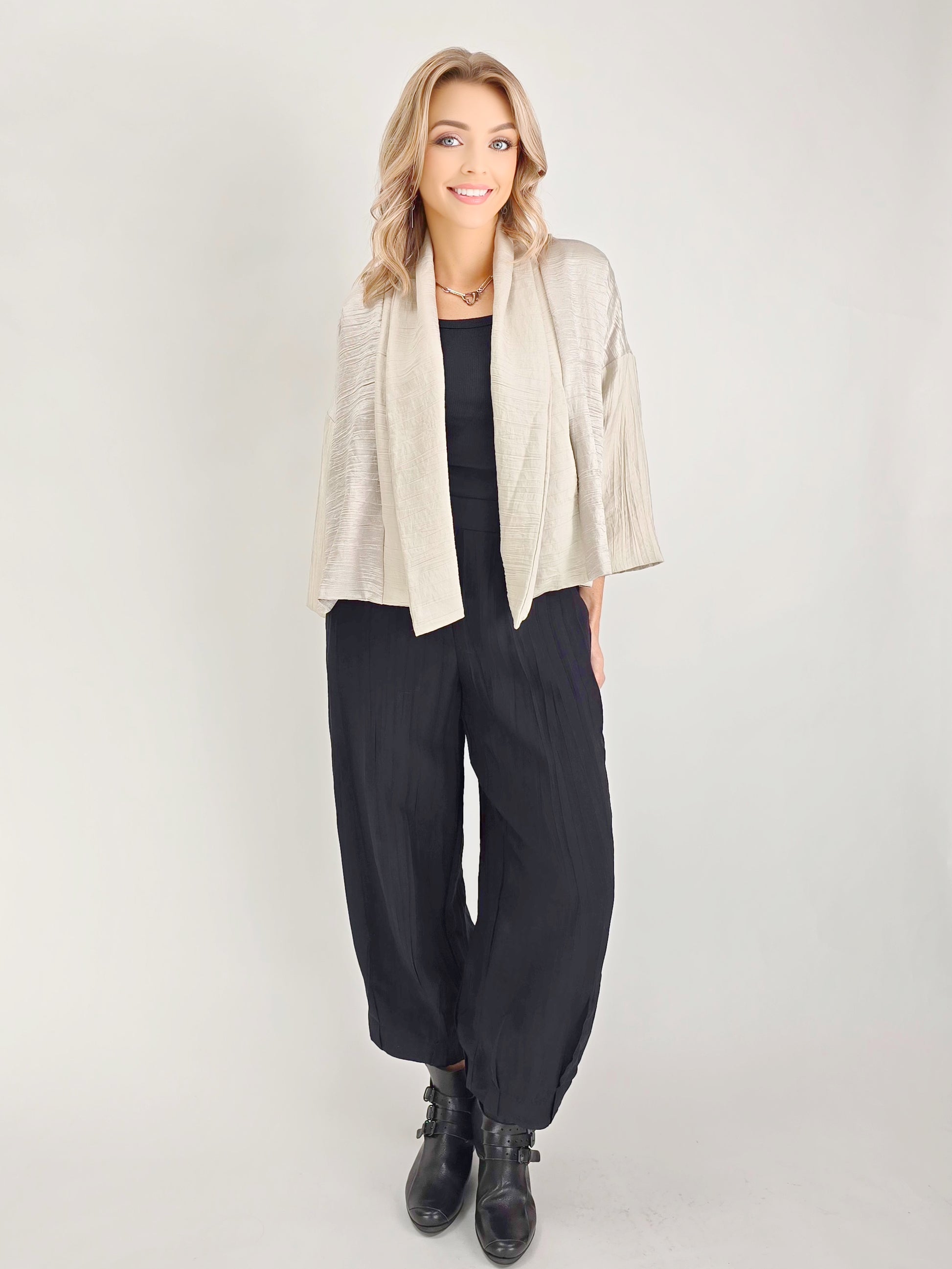 A modern classic from Ozai N Ku, these ankle pants combine texture, comfort, and understated style. Crafted from the same lightweight, crinkled fabric as the matching kimono jacket, they feature a relaxed fit with subtle volume through the leg and a slightly tapered hem. Designed with an elastic waistband for ease and movement, they’re perfect for both casual and dressy looks. Pair them with Ozai N Ku’s coordinating jacket for an effortlessly chic ensemble.