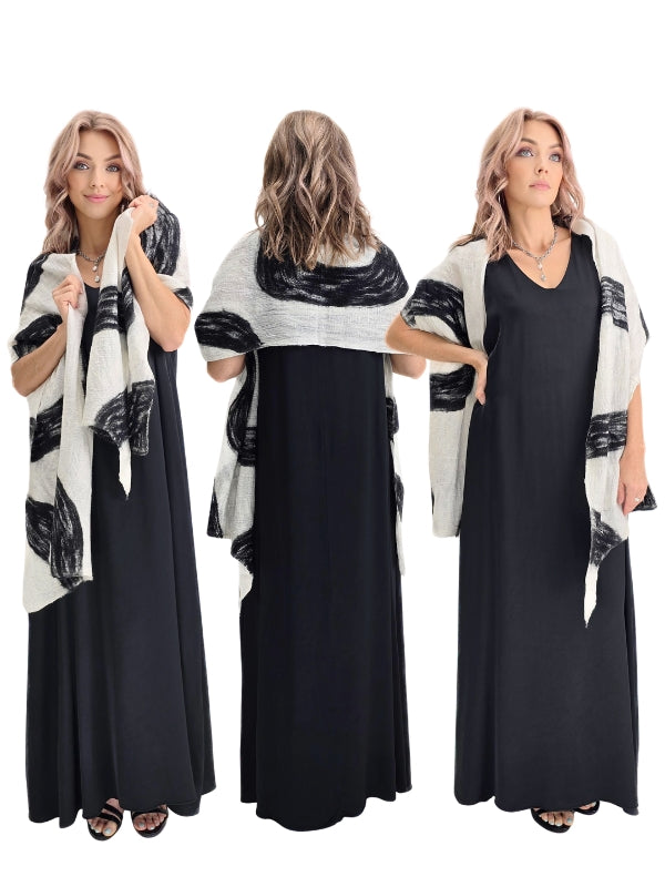 Recycled gold sari patches felted together with black merino wool to form a beautiful stained glass collage. All scarves are handmade, fair trade, and handled with care. Consists of merino wool on recycled saris from Nepal.