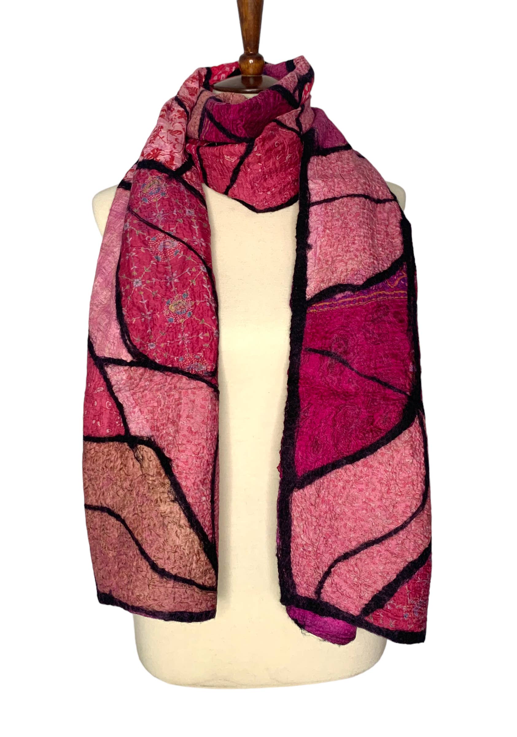 Recycled pink sari patches felted together with black merino wool to form a beautiful stained glass collage. All scarves are handmade, fair trade, and handled with care. Consists of merino wool on recycled saris from Nepal.