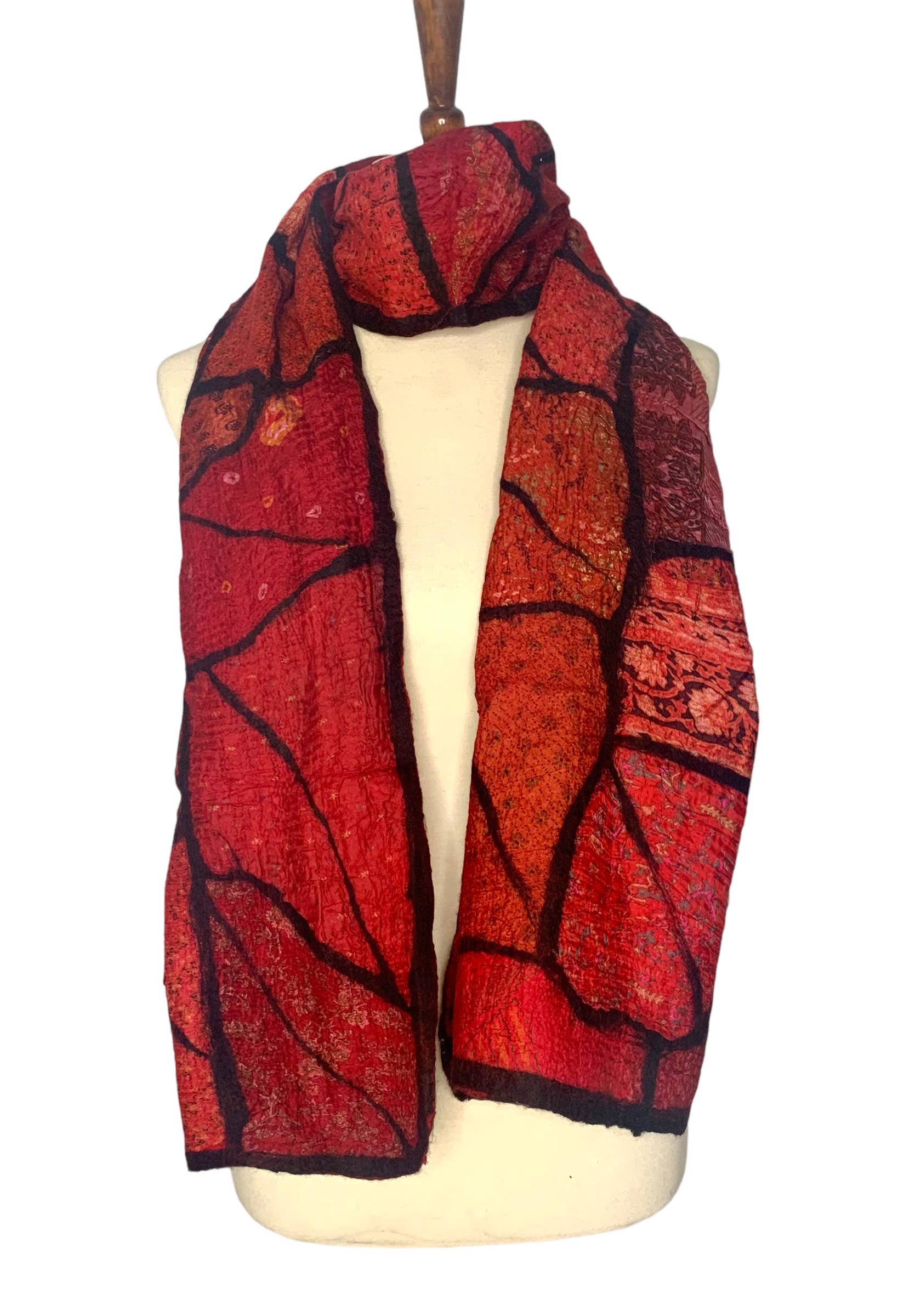 Recycled red sari patches felted together with black merino wool to form a beautiful stained glass collage. All scarves are handmade, fair trade, and handled with care. Consists of merino wool on recycled saris from Nepal.