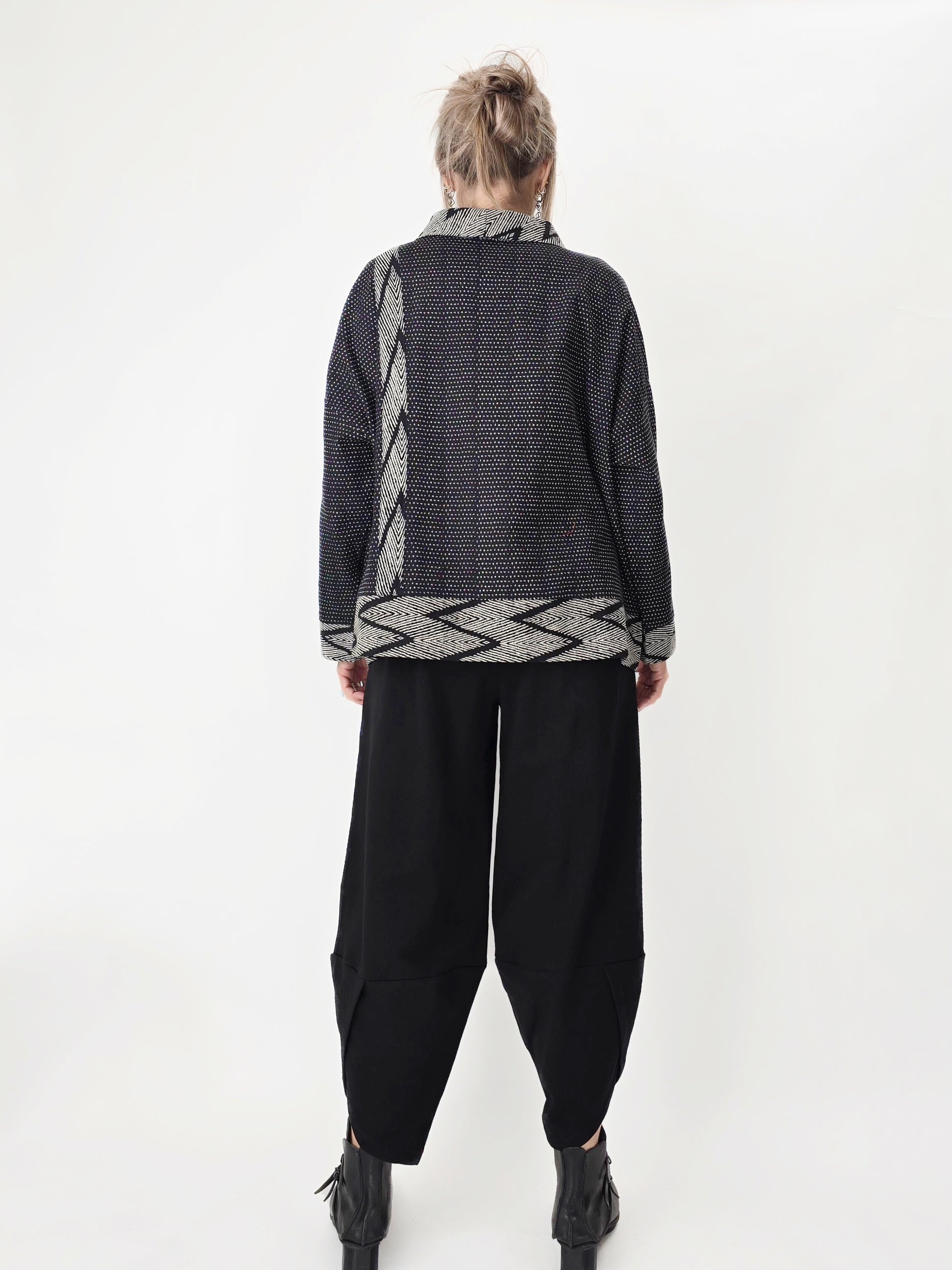 This Made in Thailand oversized blouse is crafted from 100% cotton with a striking Japanese-inspired pattern. The patchwork mix of small dotted weaves and bold zigzag stripes creates a modern, artistic look. A rolled collar frames the neckline beautifully, while dropped shoulders and a relaxed fit make it easy to wear and flattering on all body types.