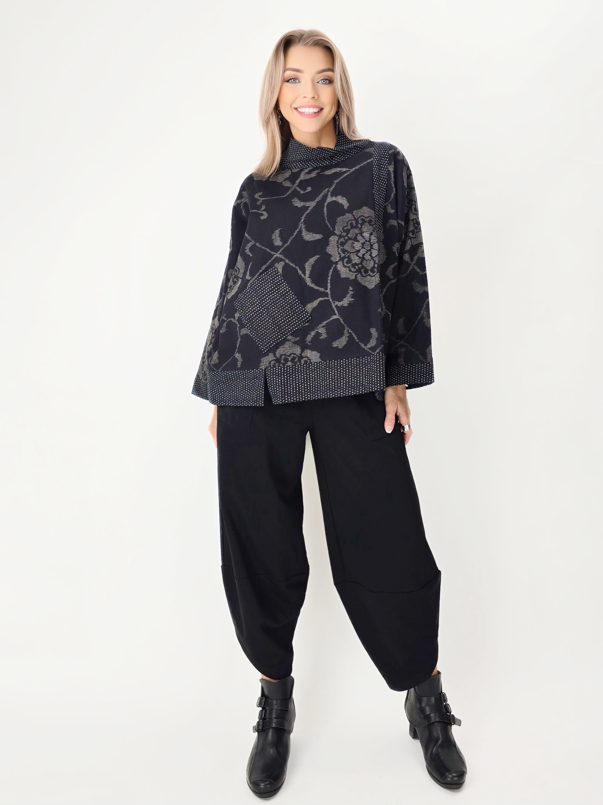 This Made in Thailand oversized blouse is crafted from 100% cotton with a striking Japanese-inspired pattern. The patchwork mix of small dotted weaves and bold zigzag stripes creates a modern, artistic look. A rolled collar frames the neckline beautifully, while dropped shoulders and a relaxed fit make it easy to wear and flattering on all body types.